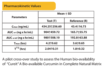 Cette matrice naturelle complète a démontré son très haut pouvoir d’assimilation lors d’essais cliniques in vivo en bioéquivalence comparé à la curcumine seule, ainsi que des résultats probants in vivo humain sur l’arthrite rhumatoïde et la sarcopénie.